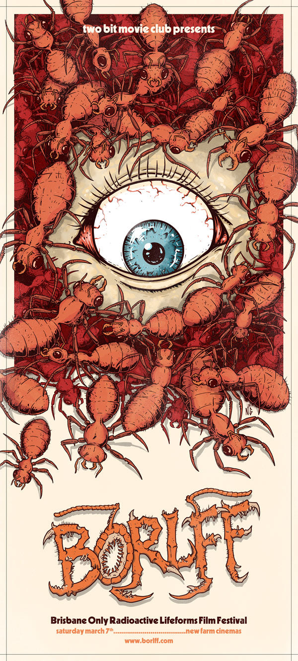 Two Bit Movie Club’s bonus single day BORLFF will be taking place at the historic New Farm Cinemas on Saturday the 7th of March. Two Bit Movie club is the spawn of Brisbane bars Netherworld and The Scratch. This edition’s art is by Brisbane artist Nelson Gibbins.